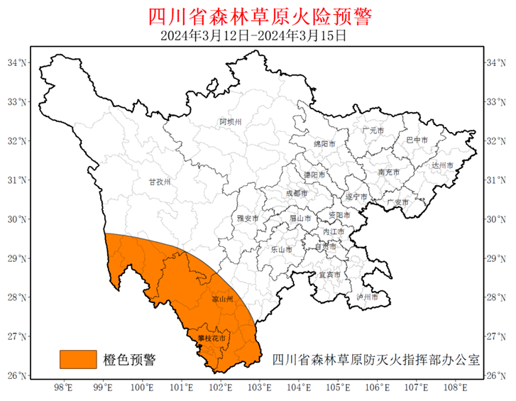 經(jīng)省森防指辦公室與省林草局、四川氣象局及相關(guān)地區(qū)會(huì)商,預(yù)計(jì)3月12日—15日攀枝花市,甘孜州西南部,涼山州西部、中部和南部(涉及17個(gè)縣級(jí)行政單位,具體范圍見(jiàn)附件)森林草原火險(xiǎn)等級(jí)將維持在高度危險(xiǎn)級(jí)別,特發(fā)布高森林草原火險(xiǎn)橙色預(yù)警。
