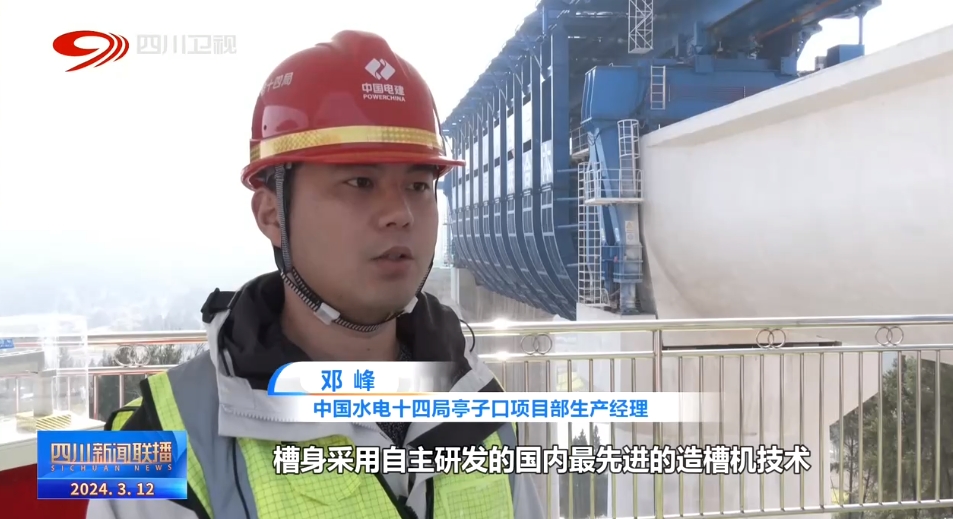 中國(guó)水電十四局亭子口項(xiàng)目部生產(chǎn)經(jīng)理 鄧峰:槽身采用自主研發(fā)的國(guó)內(nèi)最先進(jìn)的造槽機(jī)技術(shù),運(yùn)用在渡槽施工中,優(yōu)點(diǎn)在于施工效率高,安全系數(shù)高。