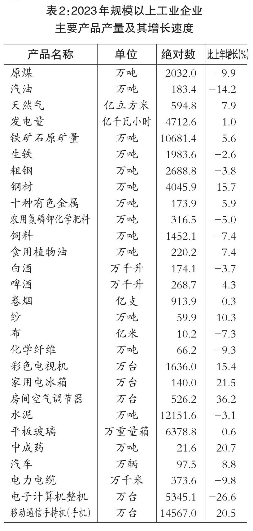 從主要產(chǎn)品產(chǎn)量看,原煤產(chǎn)量比上年下降9.9%,發(fā)電量增長1.0%,天然氣增長7.9%,單晶硅增長113.2%,鋼材增長15.7%,彩色電視機增長15.4%,汽車增長8.8%,啤酒增長4.3%。全年規(guī)模以上工業(yè)企業(yè)產(chǎn)銷率為95.2%。