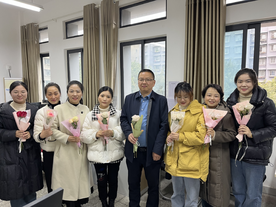 上午8時(shí)30分,該校領(lǐng)導(dǎo)肖義輝、龍?zhí)?、陳誠(chéng)等分年級(jí)組向女教職工們送去節(jié)日的慰問(wèn),感謝和致敬她們?cè)趯W(xué)校工作中的貢獻(xiàn)和付出。老師們收到鮮花都情不自禁地露出了微笑,驚喜與感動(dòng)在眼角綻放。