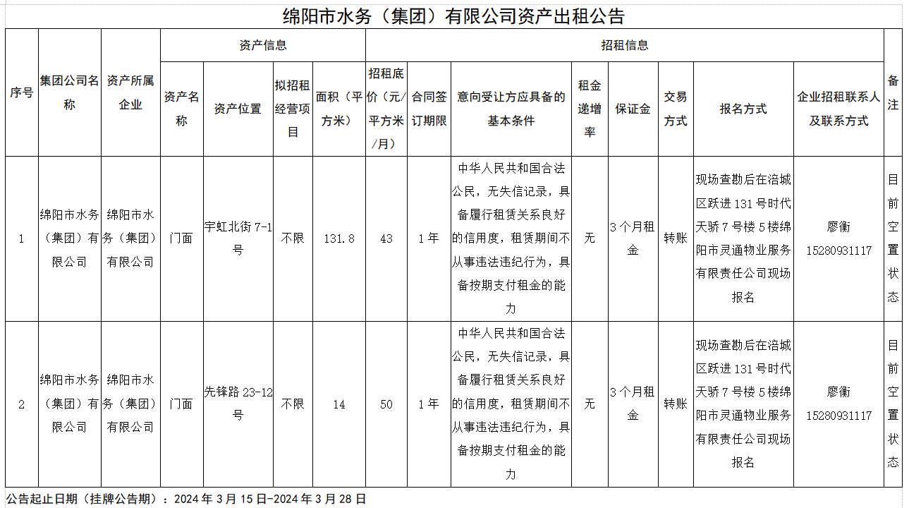 綿陽市水務(wù)(集團(tuán))有限公司資產(chǎn)出租公告