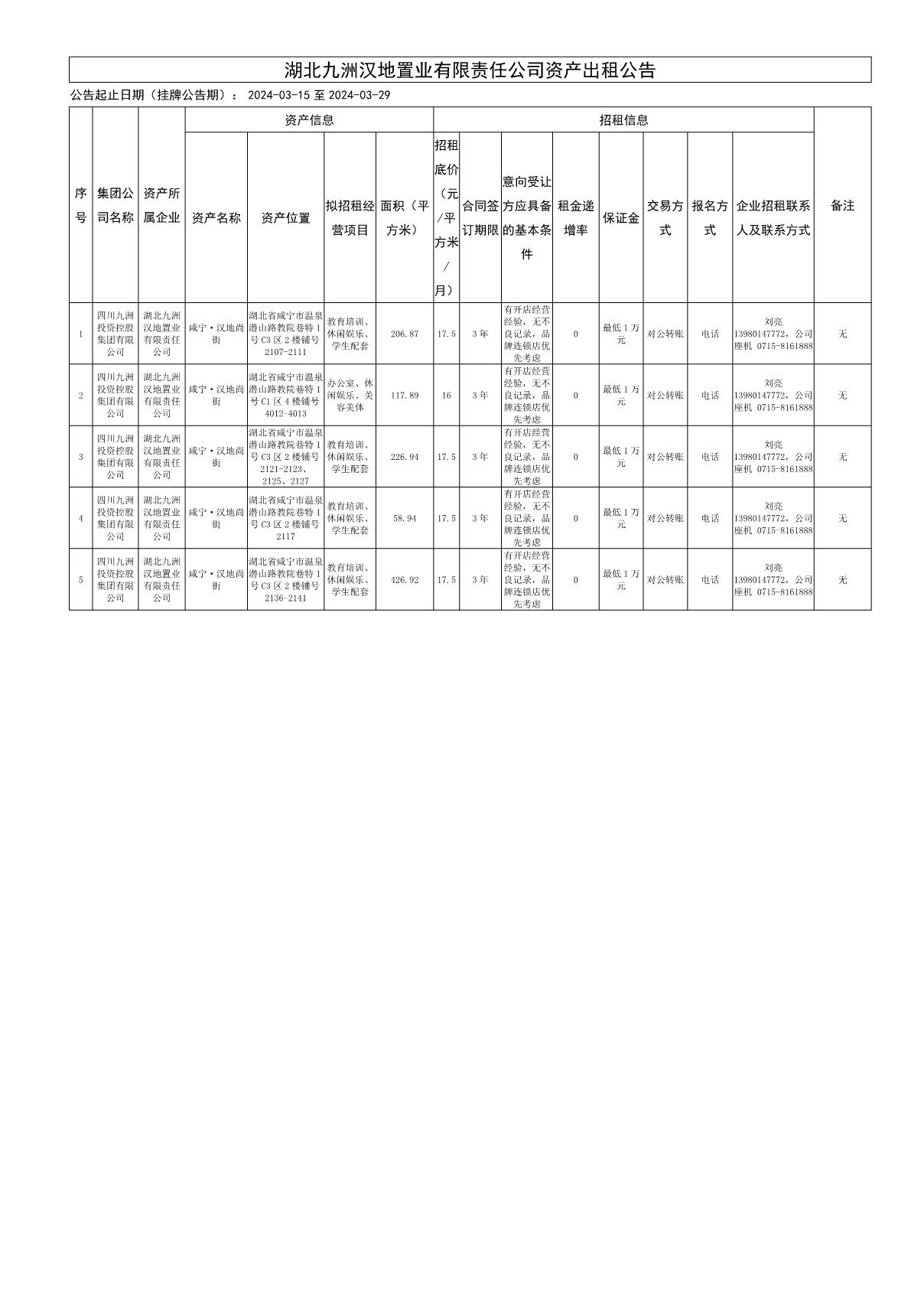 湖北九洲漢地置業(yè)有限責(zé)任公司資產(chǎn)出租公告
