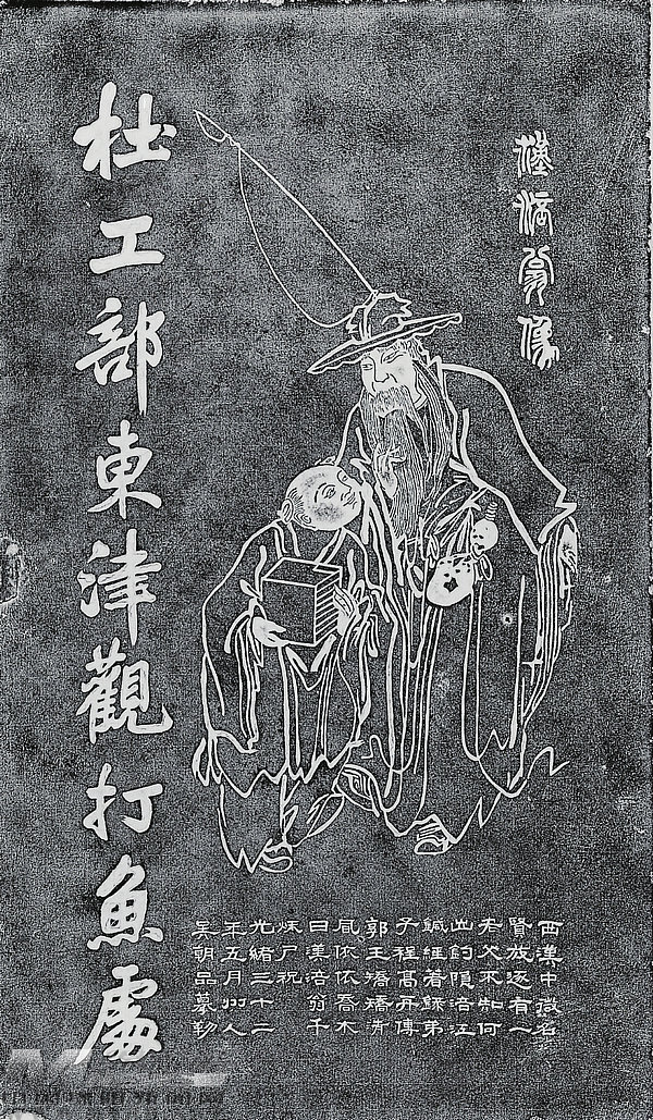石碑左側(cè)雕刻有“杜工部東津觀打魚處”,右上側(cè)雕刻篆書“漢涪翁像”。中間雕刻一幅畫像,畫像中的老人頭戴笠帽,長(zhǎng)須飄飄,左手執(zhí)魚竿覆于背后,右手曲指舉于胸前。老人的身前,是一位手捧書籍的孩童,側(cè)耳傾聽狀。