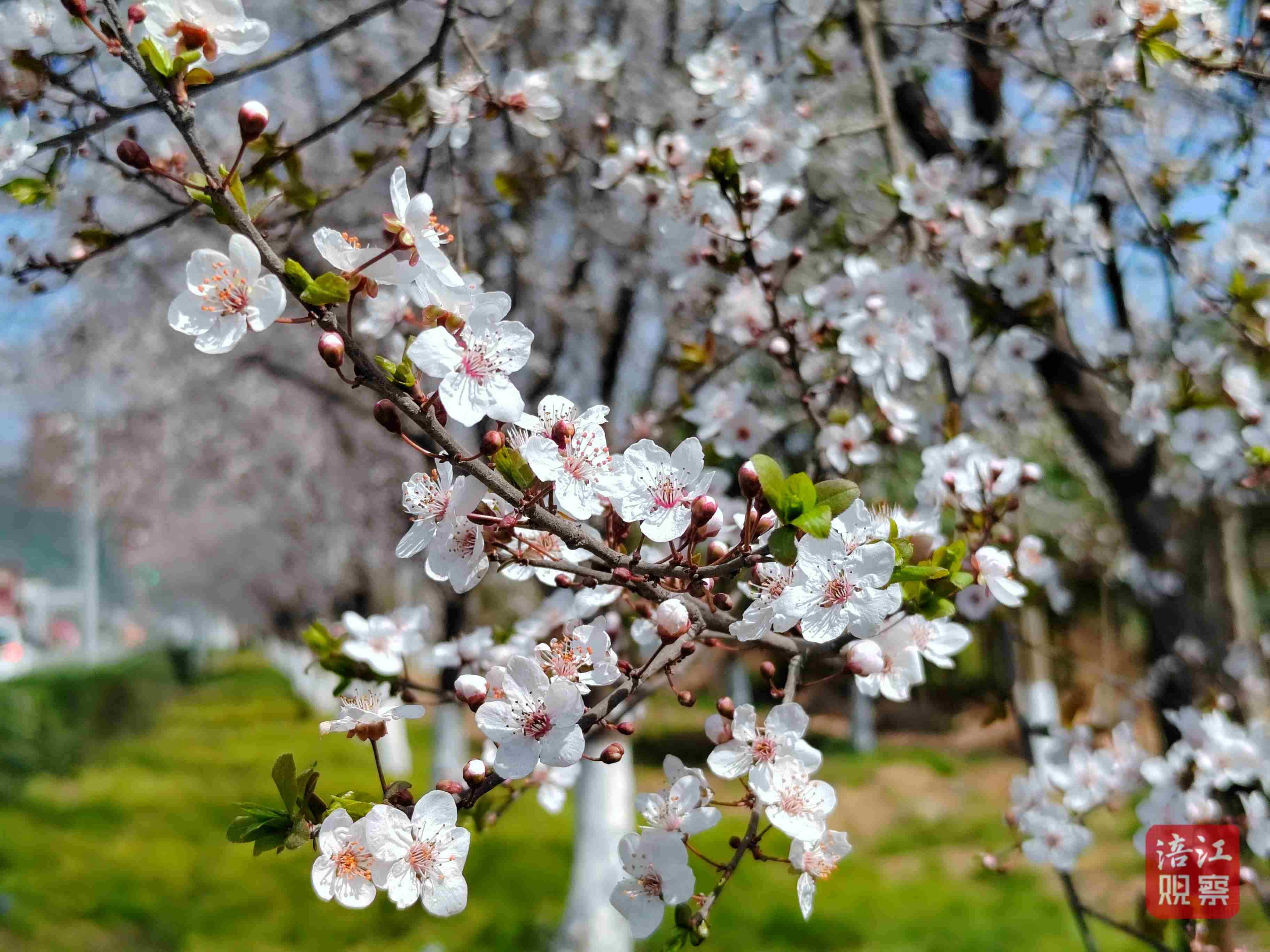 在江油市西環(huán)線道路兩旁,紅葉李含苞怒放,遠(yuǎn)望似兩抹新落的春雪。樹下落英繽紛,讓路人都不忍下腳。