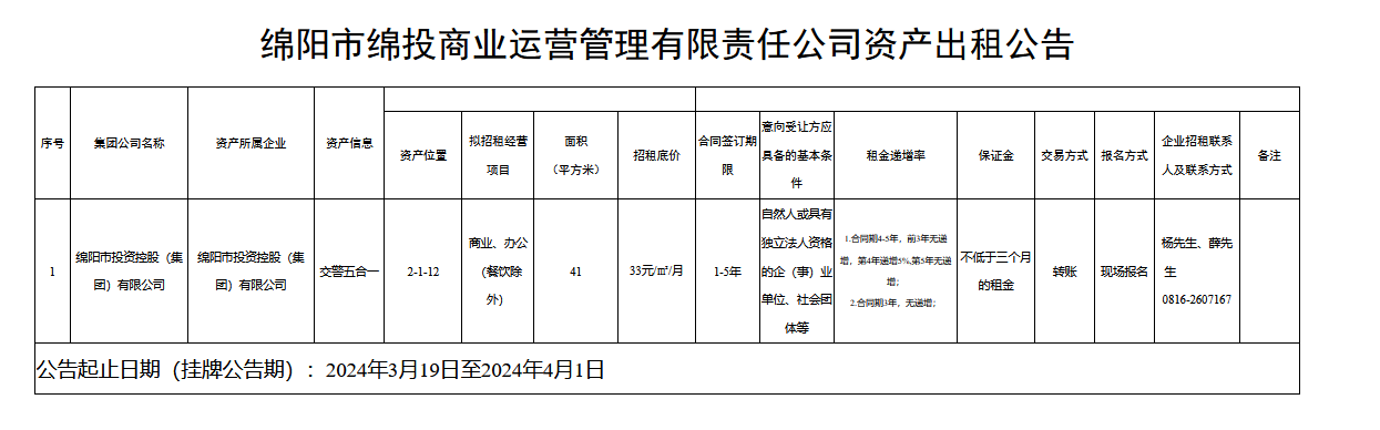 綿陽市綿投商業(yè)運營管理有限責任公司資產(chǎn)出租公告