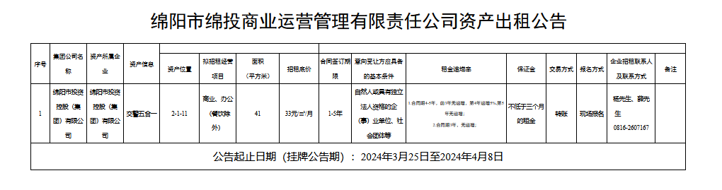 綿陽市綿投商業(yè)運營管理有限責任公司資產(chǎn)出租公告