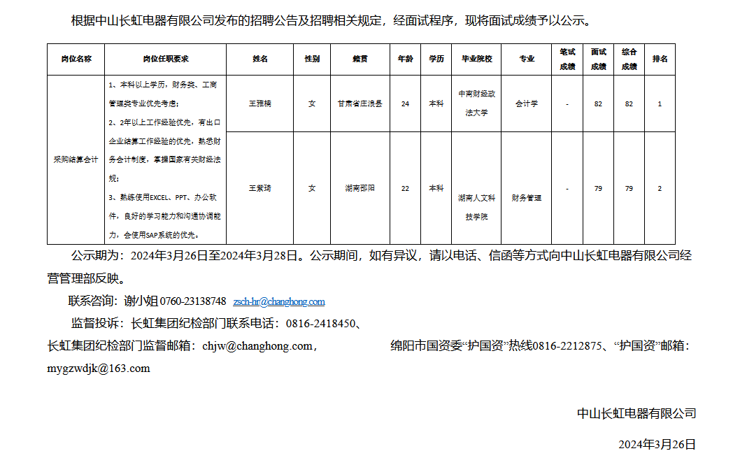 中山長虹電器有限公司關(guān)于招聘采購結(jié)算會計成績的公示