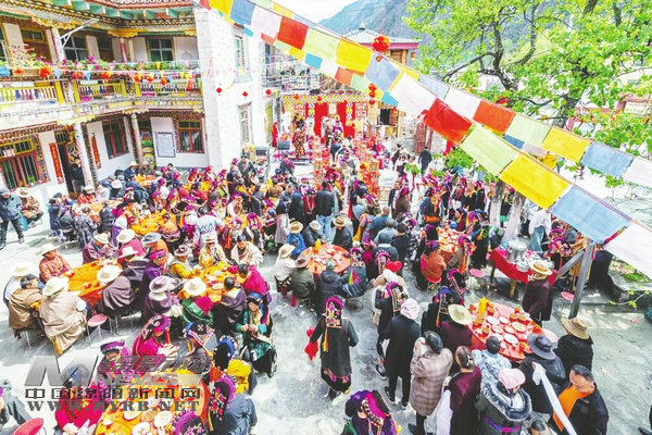 3月23日上午,在距離金川縣城57公里的“中國民間藝術(shù)之鄉(xiāng)”馬奈鎮(zhèn),身著盛裝的馬奈人在梨樹環(huán)繞的路邊廣場(chǎng),跳起了馬奈鍋莊,迎接來自各地的游客。