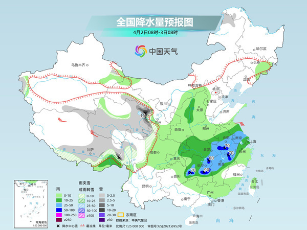 4月2日,西藏北部和東部、青海東部和南部、甘肅河西等地部分地區(qū)有小雪或雨夾雪,其中,西藏東南部、青海東部等地部分地區(qū)有中雪到大雪,青海東部等地局地暴雪(10~15毫米)。西藏東南部、江淮大部、江漢、江南中北部、重慶東北部等地部分地區(qū)有中到大雨,其中,安徽中南部、湖北東部、湖南西南部和東部、江西北部等地部分地區(qū)有暴雨。