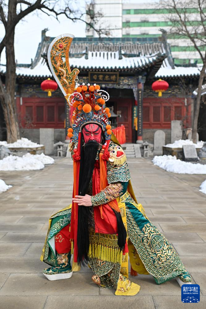 在太原大關帝廟,到此練習的晉劇非遺代表性傳承人武凌云披掛戲裝,一手持青龍偃月刀,一手掠須,威風凜凜,舉手投足間顯現(xiàn)關公風范。