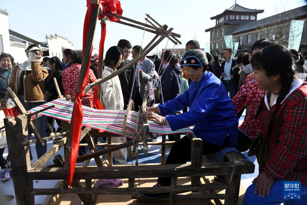 4月4日,水落坡鎮(zhèn)鄉(xiāng)村社火隊(duì)隊(duì)員在演繹魯北鄉(xiāng)村的老粗布織布場(chǎng)景。