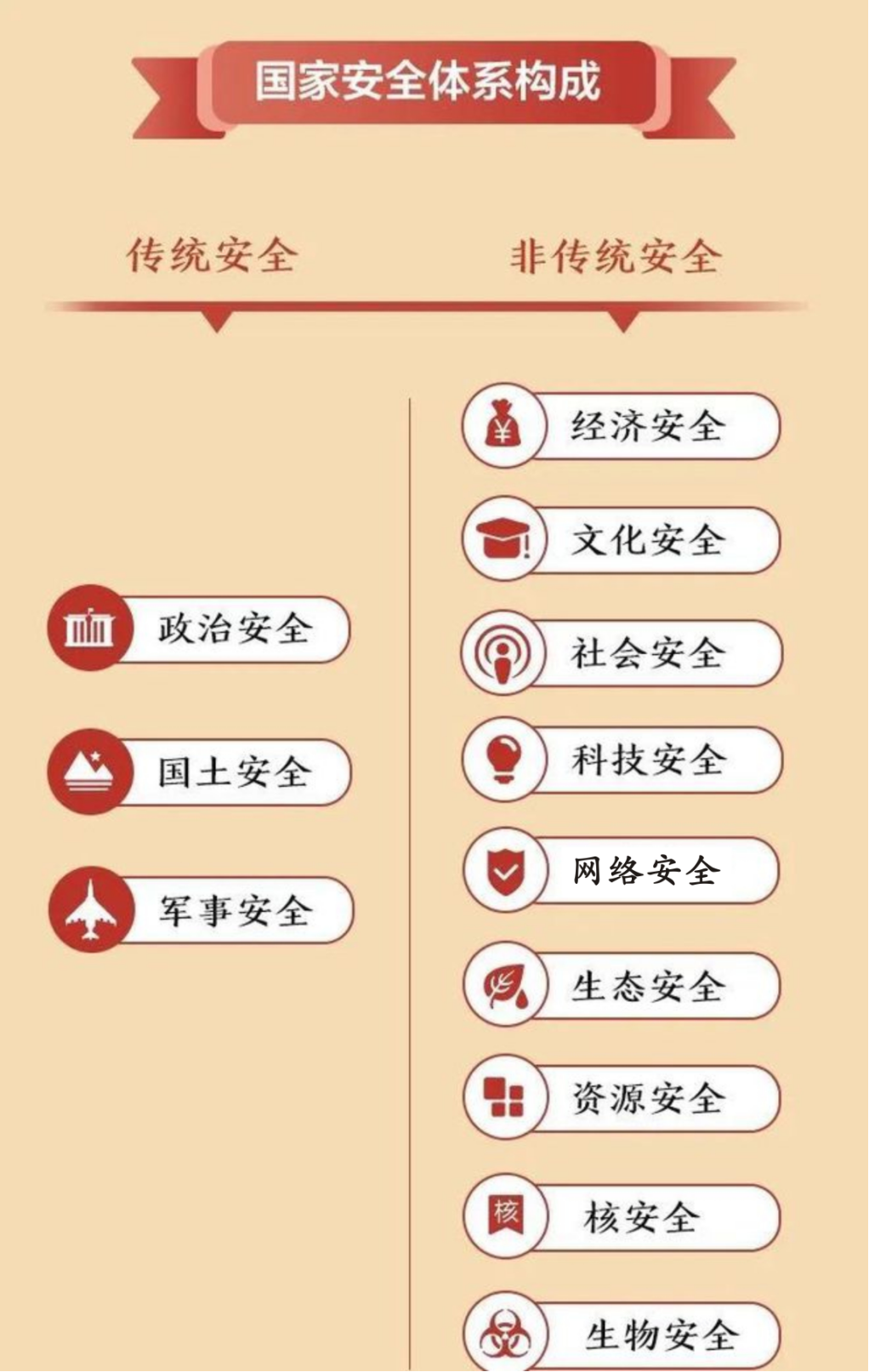 國家安全涉及的16個重點領域包括:政治安全、國土安全、軍事安全、經(jīng)濟安全、文化安全、社會安全、科技安全、網(wǎng)絡安全、生態(tài)安全、資源安全、核安全、海外利益安全、生物安全、太空安全、深海安全、極地安全等。