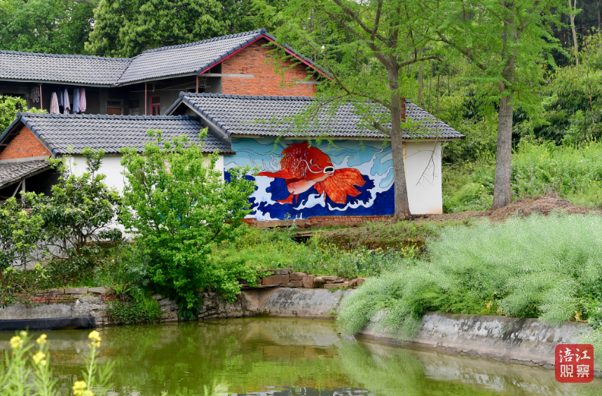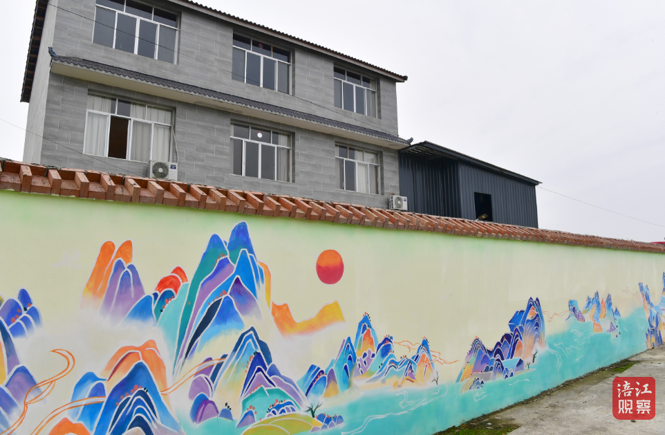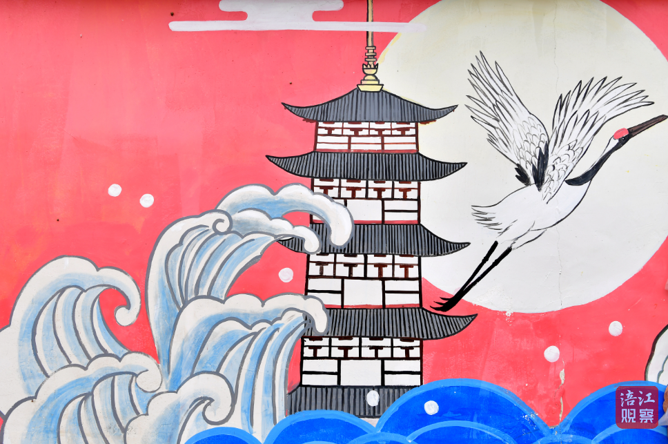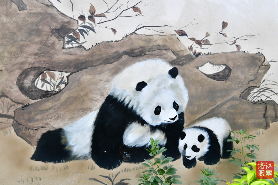 墻繪內(nèi)容除了國寶大熊貓、仙鶴、金魚、飛鳥等,還有傳統(tǒng)的閣樓建筑、巨幅山水、稻谷豐收和人物等圖案,使原本空落落的墻面煥然一新。