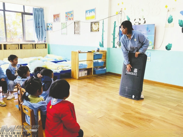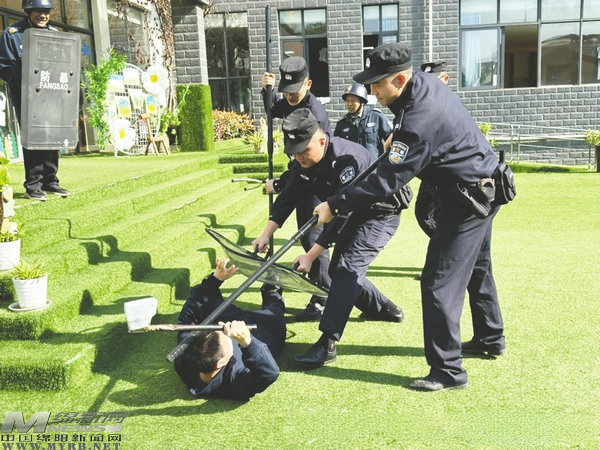 當(dāng)日上午10時(shí)開始演練。“可疑人員”借給孩子送衣物的理由試圖闖入幼兒園。安保人員發(fā)現(xiàn)其神色慌張、形跡可疑,對(duì)其進(jìn)行阻攔,“歹徒”拿出“兇器”揮舞,安保人員利用鋼叉、護(hù)盾等防暴器械奮力抵抗。一名安保人員迅速向上級(jí)和派出所報(bào)案,請(qǐng)求支援。幼兒園通訊聯(lián)絡(luò)組第一時(shí)間通知全園師生有可疑人員闖入,啟動(dòng)幼兒園防恐防暴應(yīng)急預(yù)案。