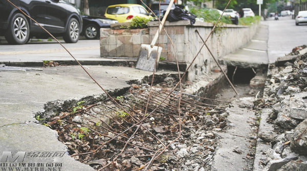 4月9日上午10點左右,記者在現(xiàn)場看到,兩名施工人員正在對一處破損蓋板進行清除處置。記者沿路查看,破損蓋板已經(jīng)裸露出鋼筋,并且形成了一定的坑洞,影響來往行人和車輛通行。