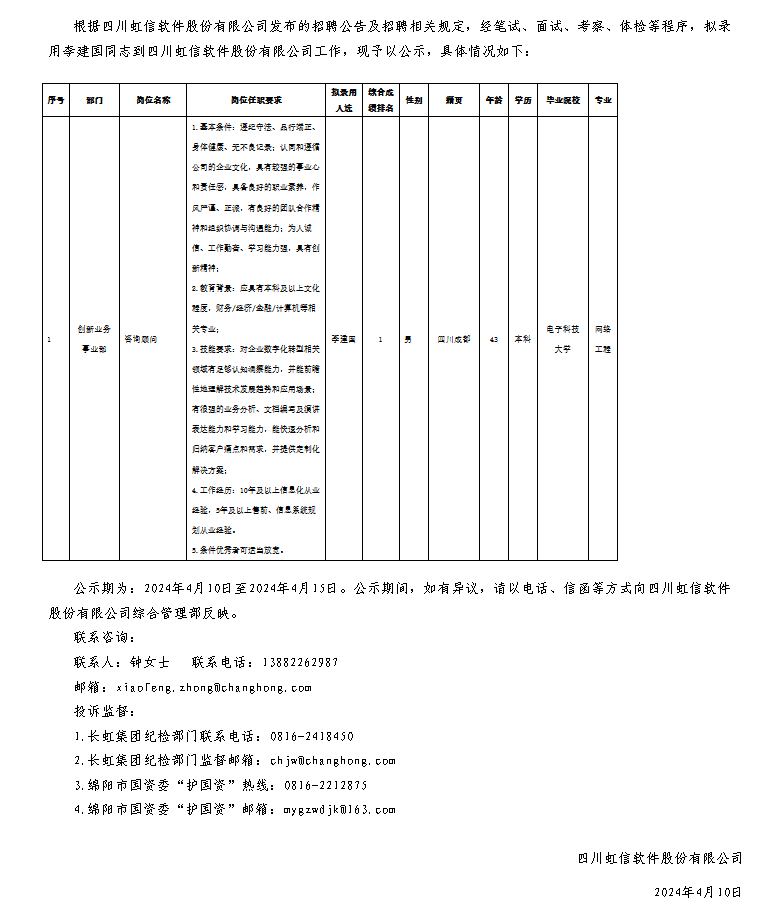 四川虹信軟件股份有限公司關(guān)于招聘咨詢(xún)顧問(wèn)崗位擬錄用人員的公示