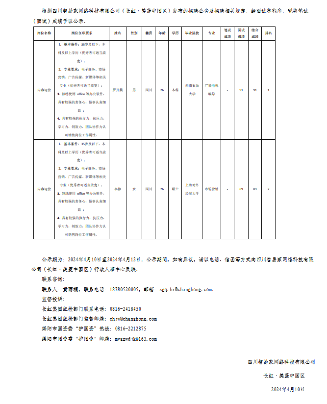 四川智易家網(wǎng)絡科技有限公司關(guān)于招聘內(nèi)容運營崗位測試成績的公示
