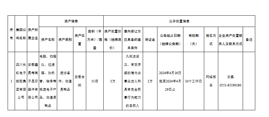 安徽鑫昊等離子顯示器件有限公司資產(chǎn)處置公告