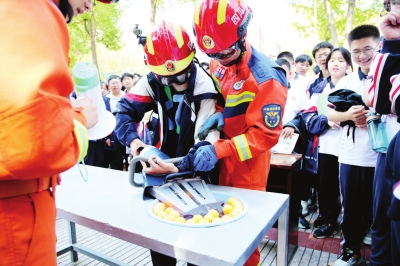疏散演練結束后,消防宣傳員為6000余名師生帶來消防知識宣講課,就火災發(fā)生后如何正確逃生自救等進行重點講解。在校園內(nèi),消防部門展出了各種救援車輛和裝備,并設置液壓擴張鉗夾取乒乓球、消防作戰(zhàn)服穿戴、消防水槍水帶快速連接鋪設等互動體驗項目,吸引不少學生積極參與體驗(如圖)。“液壓擴張鉗太重了,我用了很大力氣才夾起乒乓球,消防員叔叔利用這種技術開展救援真的很不容易。”參加體驗的高一學生張恒說。