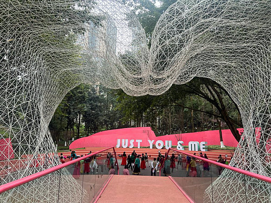 位于八橋鎮(zhèn)的愛情公園,近日在社交平臺(tái)上成為新的熱門“打卡點(diǎn)”。這里原本只是周邊小區(qū)的配套綠化區(qū),大渡口區(qū)城市管理局在2023年以“愛情”為主題對(duì)其進(jìn)行了改建。行走其間,各處粉色、紫色的景觀陳設(shè),被修剪成愛心形狀的樹木,“雙手捧心”的鵲橋等,時(shí)刻提醒著游客公園名字寄托的美麗意蘊(yùn)。
