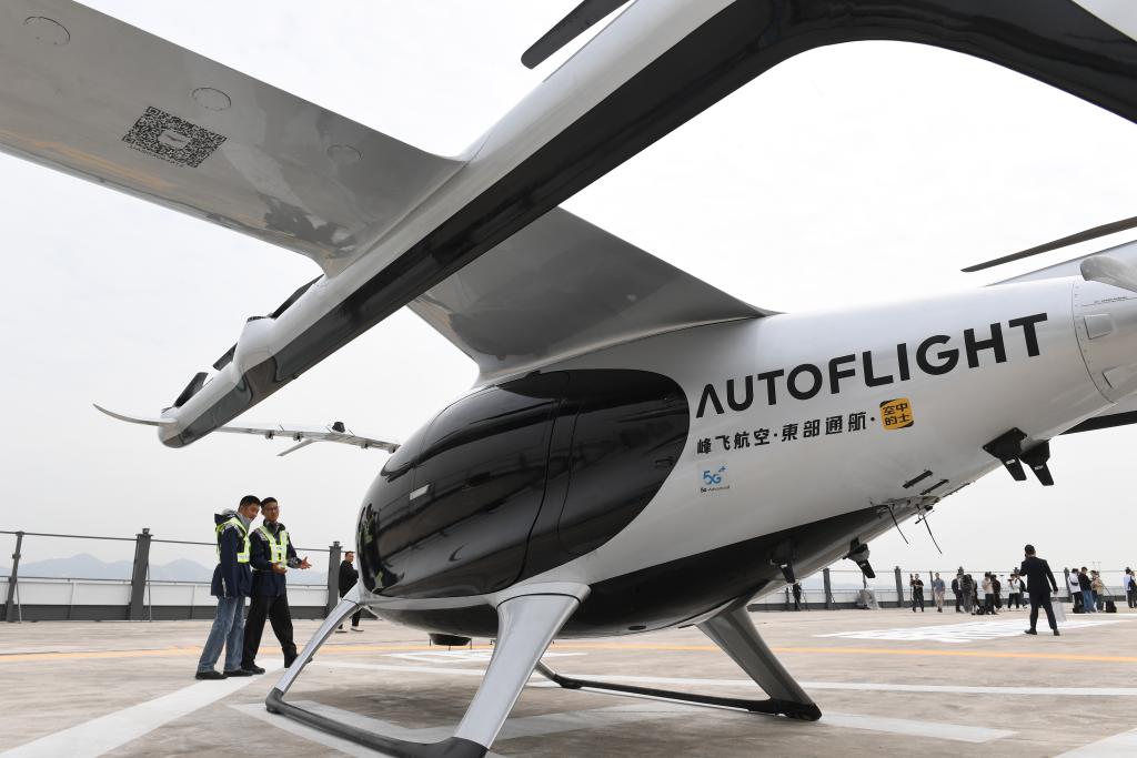 2月27日,在深圳蛇口郵輪母港,工作人員查看5座電動垂直起降航空器盛世龍。新華社記者 毛思倩 攝