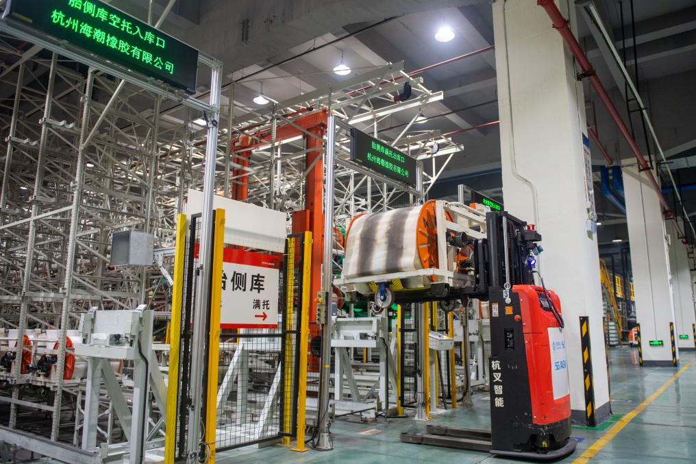 在杭州市錢塘區(qū)中策橡膠集團股份有限公司未來工廠內(nèi),無人叉車在運輸產(chǎn)品(2024年2月23日攝)。新華社記者 江漢 攝