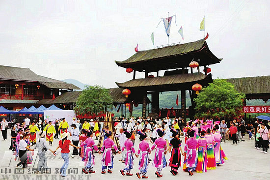游客與羌族群眾一起跳沙朗(視覺綿陽 周冀川 攝)