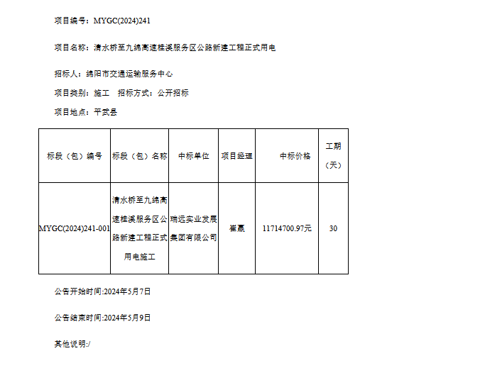 清水橋至九綿高速桂溪服務區(qū)公路新建工程正式用電中標結果公告