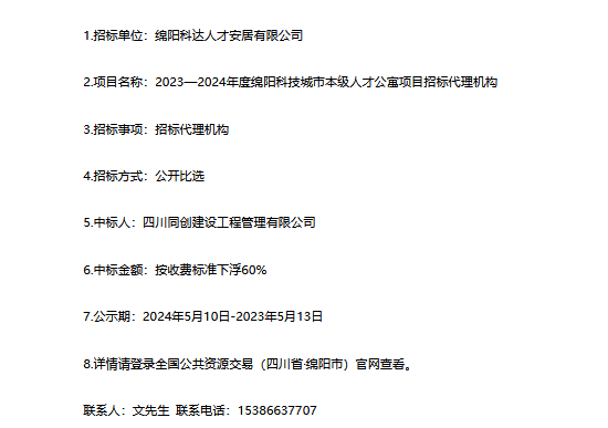 2023—2024年度綿陽(yáng)科技城市本級(jí)人才公寓項(xiàng)目招標(biāo)代理機(jī)構(gòu)中標(biāo)(選)結(jié)果公示