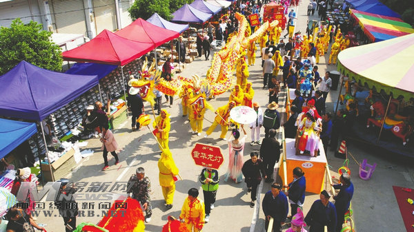 開幕式演出后,民俗文化巡游出場(chǎng)。經(jīng)典戲劇人物、舞獅舞龍、采蓮船……各種富有中華傳統(tǒng)文化色彩的民俗元素組成一條長長的“彩龍”,浩浩蕩蕩地游走在古鎮(zhèn)的大街小巷,所到之處引發(fā)游客和鄉(xiāng)親們爭(zhēng)相圍觀、拍照。