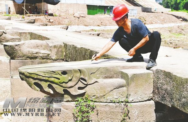 “在龍的兩腮、后腦、后頸四個(gè)地方,都用了蝴蝶榫卯進(jìn)行扣接。”陳曉順指著保存較好的第三條龍龍頭向記者介紹,和木匠榫卯工藝不同,石雕榫卯更大、更粗獷,并且修復(fù)八條龍龍頭、龍尾和雕刻所用的石材,都是從郪江河床里打撈的石頭,這些從橋面掉落的板石,歷經(jīng)河水的沖刷,經(jīng)過(guò)雕刻技藝的古法處理,以修舊如舊的方式再現(xiàn)龍頭龍尾原生態(tài)的輪廓,將還原其歷經(jīng)風(fēng)雨滄桑的形態(tài)和神韻。