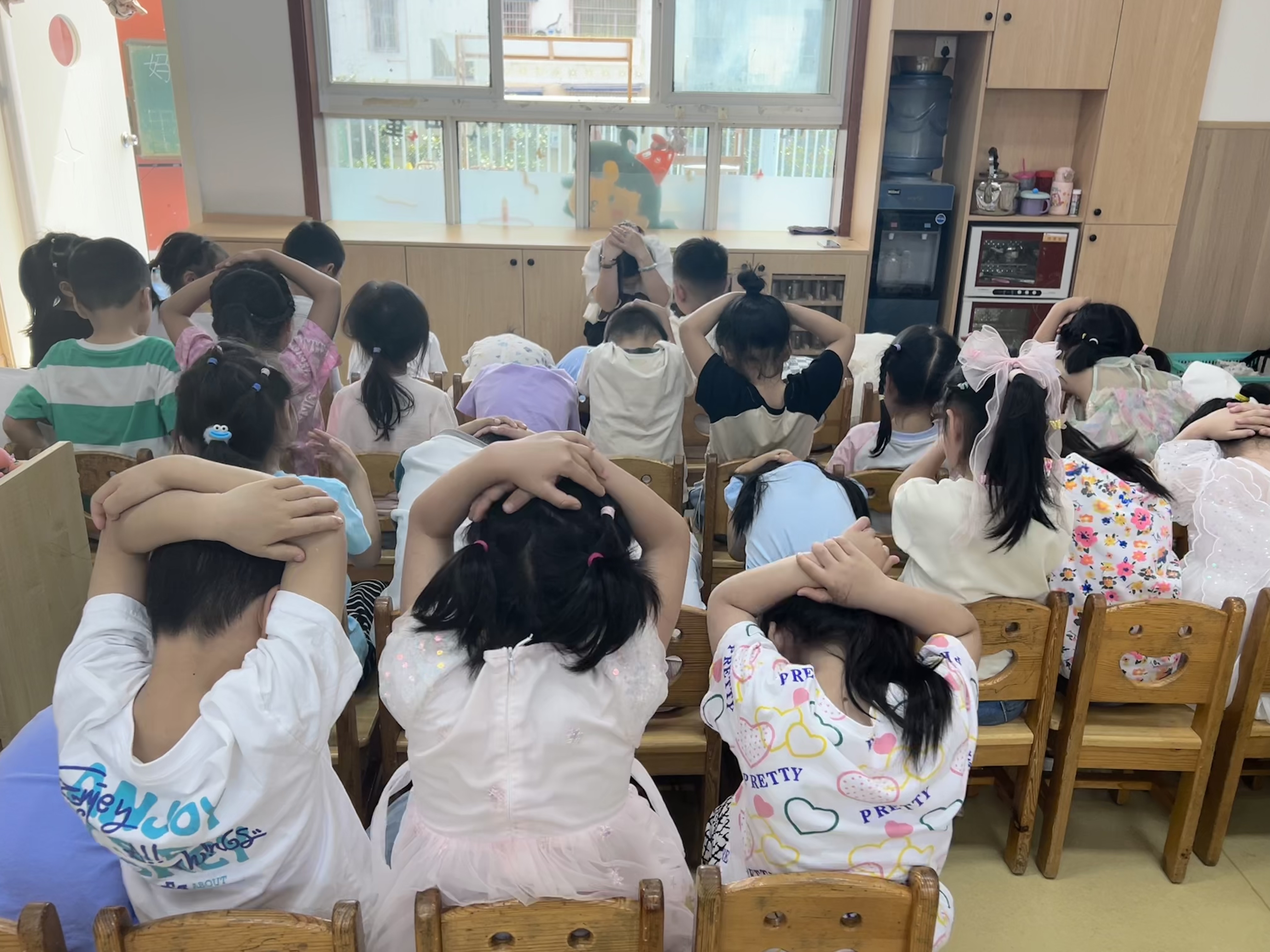 當(dāng)?shù)诙问枭⒕瘓?bào)響起撤離,老師在確定暫時(shí)安全的情況下,立即組織幼兒用手抱頭或雙手舉著枕頭、書包,彎腰低身沿著預(yù)定路線,快速有序地撤離到操場(chǎng)。