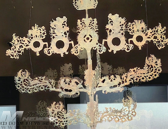 在市博物館二樓的“富樂夢想——綿陽搖錢樹陳列”中,展出了綿陽本地及國內其他地方出土的搖錢樹,位于展廳正中的那株東漢搖錢樹,就有龍的裝飾。