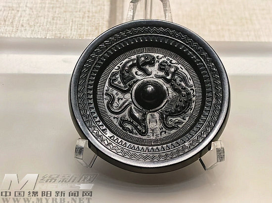 在市博物館展廳,陳列了一件1996年出土于游仙區(qū)白蟬鄉(xiāng)朱家梁子1號崖墓中的神獸黑漆古銅鏡。這件銅鏡直徑9。58厘米,厚1。03厘米,緣厚0。7厘米。銅鏡呈圓形,中心有一圓鈕座,鈕座外裝飾了一圈神獸紋,左龍右虎,張口露齒,好像在相互對峙,二獸的尾部以隸書“青羊”二字銘文。外區(qū)一圈為短直線紋,緣上兩周紋飾,內為鋸齒紋,外為雙線波折紋。