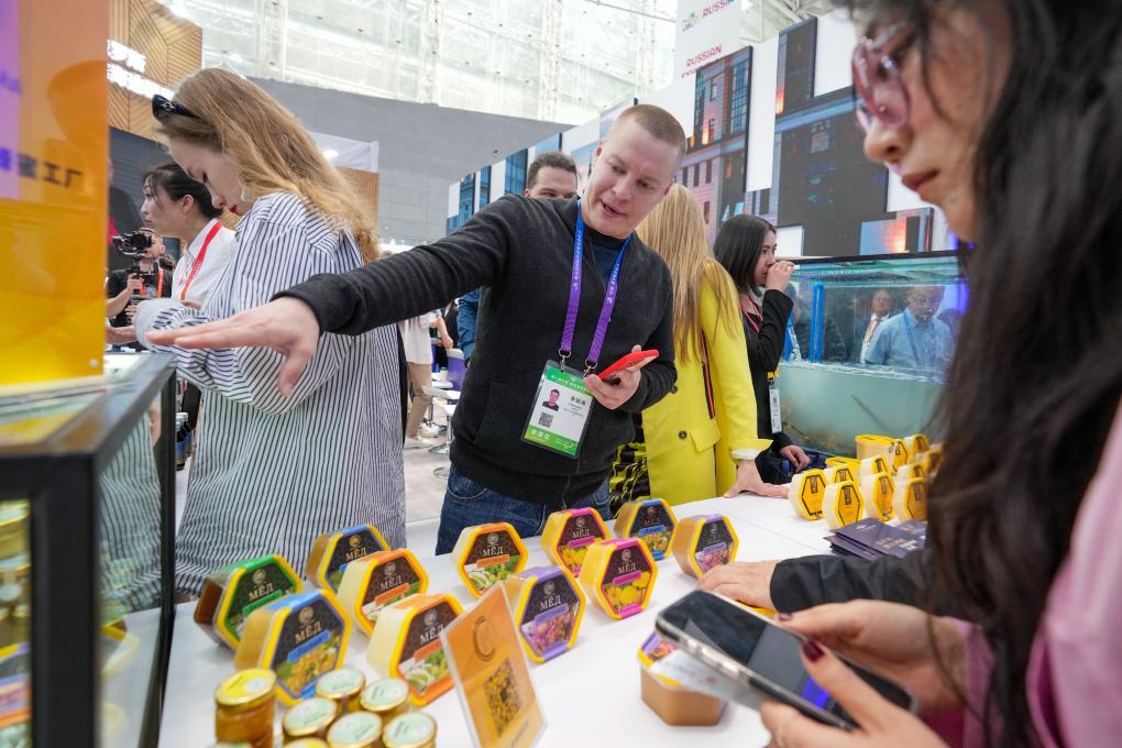 俄羅斯濱海邊疆區(qū)展區(qū)的設(shè)置,讓人仿佛穿梭于深海與城市間。帝王蟹、扇貝、青口等海產(chǎn)品吸引眾多客商駐足;展區(qū)另一側(cè),從蜂蜜、紅酒到巧克力、香腸,琳瑯滿目的展陳和貼心的試吃體驗,讓觀展者大呼“有口福了!”