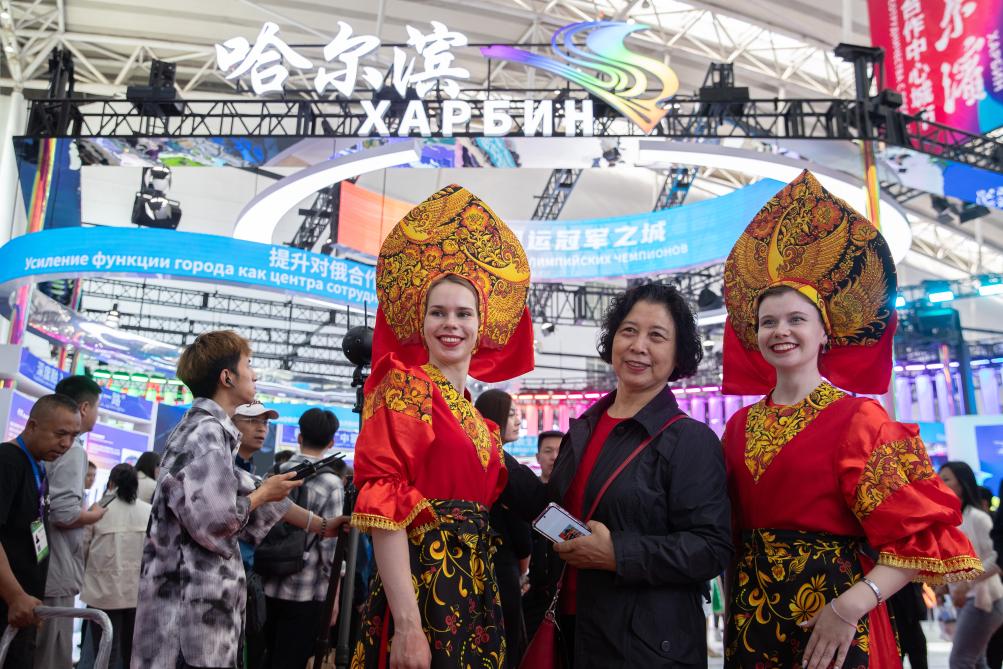 5月18日,在第八屆中俄博覽會現(xiàn)場,參會者與俄羅斯演員合影。新華社記者 張濤 攝