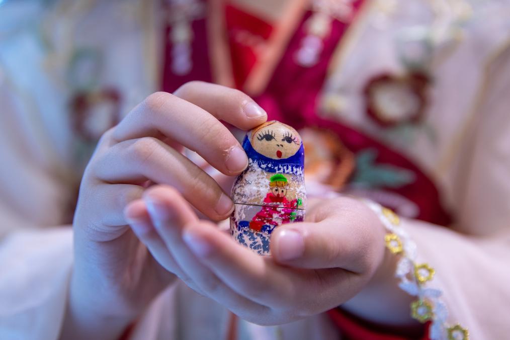5月19日,在第八屆中俄博覽會現(xiàn)場,一名小朋友展示俄羅斯套娃。新華社記者 張濤 攝