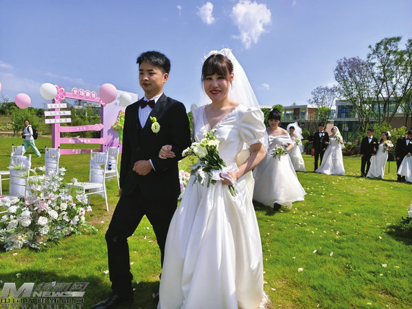 陽光、草坪、鮮花、氣球、愛心打卡點(diǎn)……當(dāng)天上午,安州區(qū)南湖公園成了一片粉紅色的甜蜜海洋。10對新人身著精心挑選的禮服,合著幸福的節(jié)拍,帶著甜蜜和溫馨攜手入場。在現(xiàn)場嘉賓和親友們的見證下,婚禮誓言、交換戒指、擁吻禮等環(huán)節(jié)一一進(jìn)行,婚禮儀式圓滿禮成。主辦方還特別安排了集體頒證環(huán)節(jié),工作人員為新人們頒發(fā)結(jié)婚證書,共同祝福新人喜結(jié)良緣。