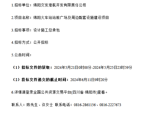 綿陽(yáng)火車站站前廣場(chǎng)及周邊配套設(shè)施建設(shè)項(xiàng)目(第二次)設(shè)計(jì)施工總承包標(biāo)段招標(biāo)公告