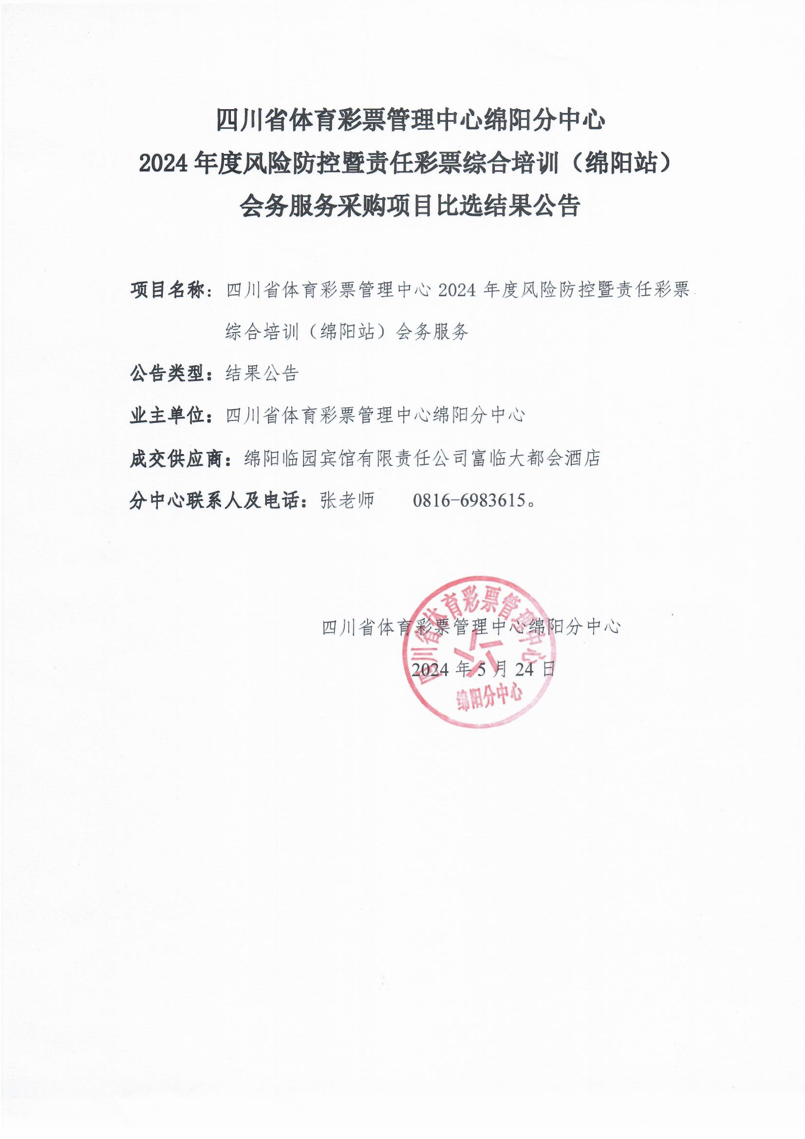 四川省體育彩票管理中心綿陽分中心2024年度風(fēng)險(xiǎn)防控暨責(zé)任彩票綜合培訓(xùn)(綿陽站)會(huì)務(wù)服務(wù)采購項(xiàng)目比選結(jié)果公告