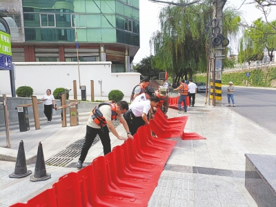演練現(xiàn)場模擬因連續(xù)多日暴雨影響,東津橋河堤處管涌,橋下大量積水,導致附近地下車庫進水。接到險情后,富樂街道應急救援隊員有序領取防汛應急物資,迅速趕赴現(xiàn)場,開展堆碼沙袋、封堵車庫、警戒線設置、交通疏散等工作,整個救援過程井然有序。
