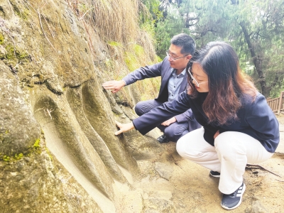 工作人員在梓潼古蜀道上的千年石板路調(diào)研