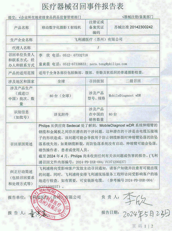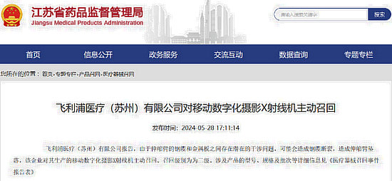 日前,江蘇省藥品監(jiān)督管理局網(wǎng)站顯示,飛利浦醫(yī)療(蘇州)有限公司(以下簡稱“飛利浦醫(yī)療”)報告稱,由于伸縮臂的鋼纜和金屬板之間存在潛在的干涉問題,可能會造成鋼纜斷裂,造成伸縮臂墜落,現(xiàn)對生產(chǎn)的移動數(shù)字化攝影X射線機主動召回。
