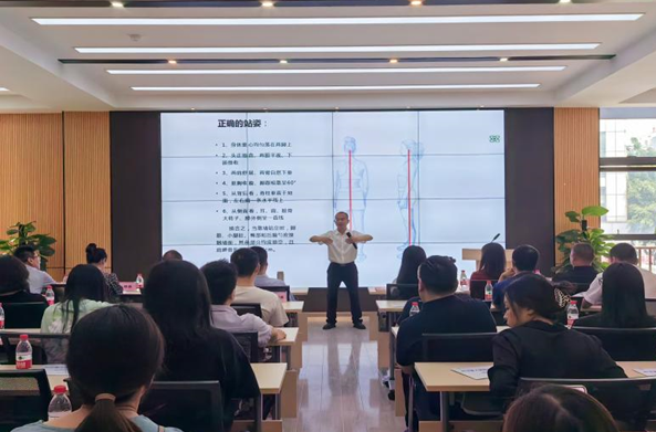 張虎主任醫(yī)師結(jié)合他豐富的臨床經(jīng)驗(yàn),從錯(cuò)誤的姿勢(shì)分析、脊柱健康知識(shí)、正確的姿勢(shì)指導(dǎo)、科學(xué)運(yùn)動(dòng)鍛煉、合理飲食及日常工作中如何進(jìn)行自我保健等方面進(jìn)行了系統(tǒng)詳細(xì)地講解,并在現(xiàn)場(chǎng)示范“米字操”“彈力帶擴(kuò)胸”“頸腰伸展”等頸肩腰腿部的正確鍛煉姿勢(shì),倡導(dǎo)辦公室人員養(yǎng)成良好的保護(hù)肩頸腰椎的意識(shí),做到張弛有度,降低因久坐、過(guò)勞等引起的身體不適,避免疾病的發(fā)生。