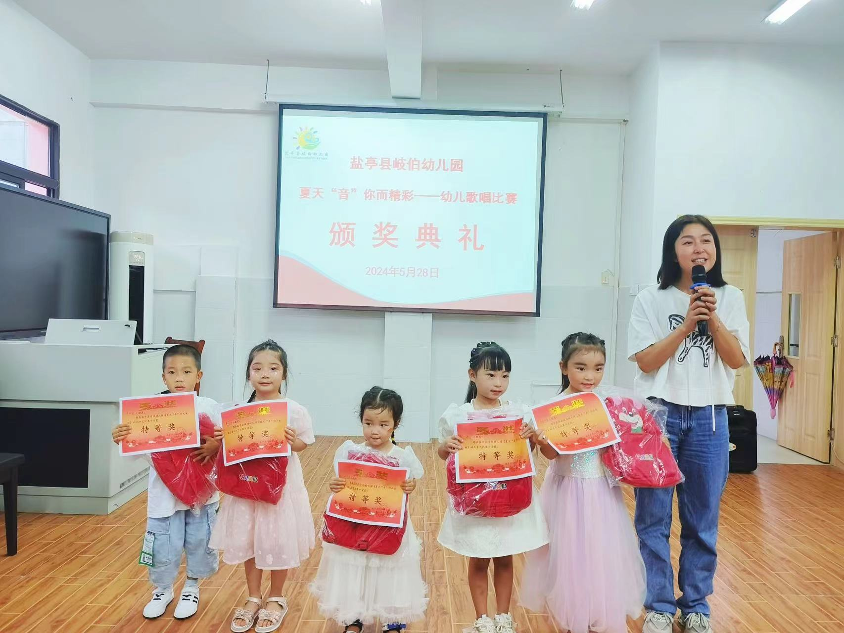 在經(jīng)過公平公正的抽簽后,比賽正式開始,比賽中,孩子們用稚嫩的童聲、有趣的演唱,獲得小觀眾們的陣陣掌聲。經(jīng)過評委公平公正的打分,共評選出5名特等獎、7名一等獎、11名二等獎。園行政為獲獎的小朋友依次頒發(fā)獎狀和獎品。