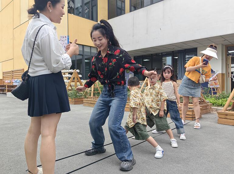 30日上午9:00,小朋友手持游園卡,走在懷舊復(fù)古的場景中,伴隨著復(fù)古的音樂,沉浸在游戲的快樂中。孩子和家長穿梭在?60年代、80年代、00年代游戲場館中,體驗著各個年代的經(jīng)典游戲,如60—70年代的木頭人、斗雞、跳格子等;80—90年代的丟手絹、挑簽、彈彈珠等;00—10年代的套圈、打地鼠、一字馬猜拳等活動,讓幼兒感受祖輩、父輩、同輩三代不同年代的童年文化印記,尋味經(jīng)典童年。