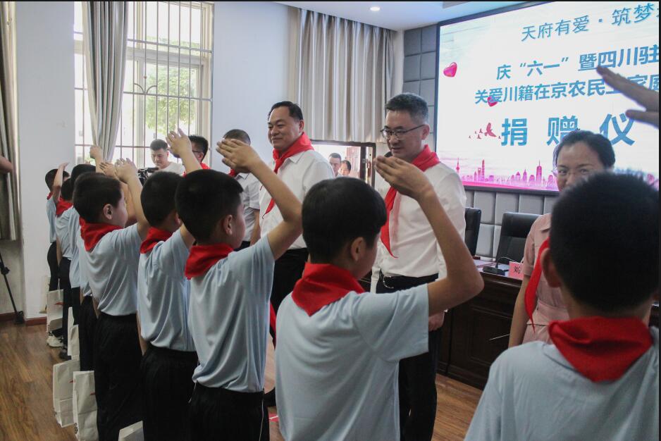 活動現(xiàn)場,許州鎮(zhèn)小學校少先隊員代表為主席臺領導佩戴紅領巾。省駐京辦黨組成員、省駐京機構黨委書記李奧博向同學們表達了“六一”兒童節(jié)的祝福,希望同學們努力學習,用優(yōu)異的成績回報黨和政府的關懷。