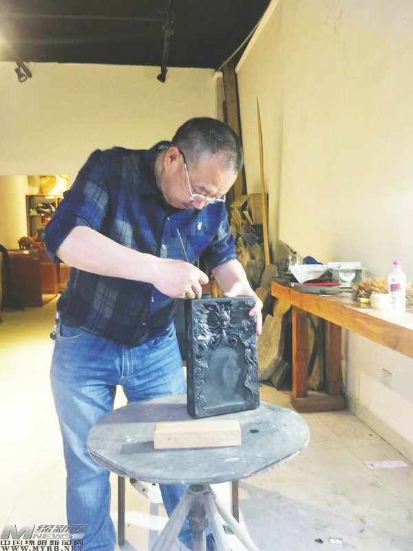 基于此,一刀一鏨,用霧山石開鑿而來的每一方硯臺,都藏著彭耘的構(gòu)思。他精心制作的太白硯、龍鳳硯、松鶴硯等或平雕、浮雕,或鏤空、鑲嵌,雕刻技法古樸、畫面生動、雅趣橫生。