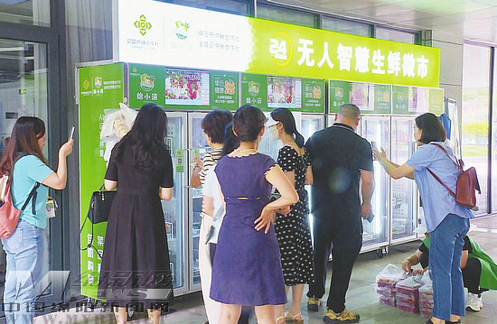 6月14日上午,記者在位于長虹世紀(jì)城2期的“綿小涪”24小時(shí)無人智慧生鮮微市站點(diǎn)看到,智能果蔬柜整齊擺放,透明的柜門讓柜內(nèi)產(chǎn)品一目了然。市民只需用手機(jī)掃描保鮮柜上的二維碼即可選購商品,完成自動計(jì)量稱重后,通過微信直接支付。