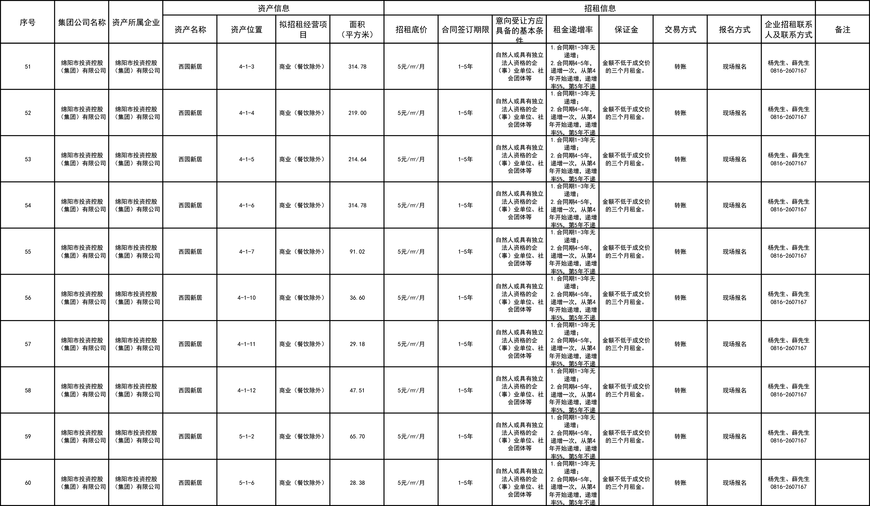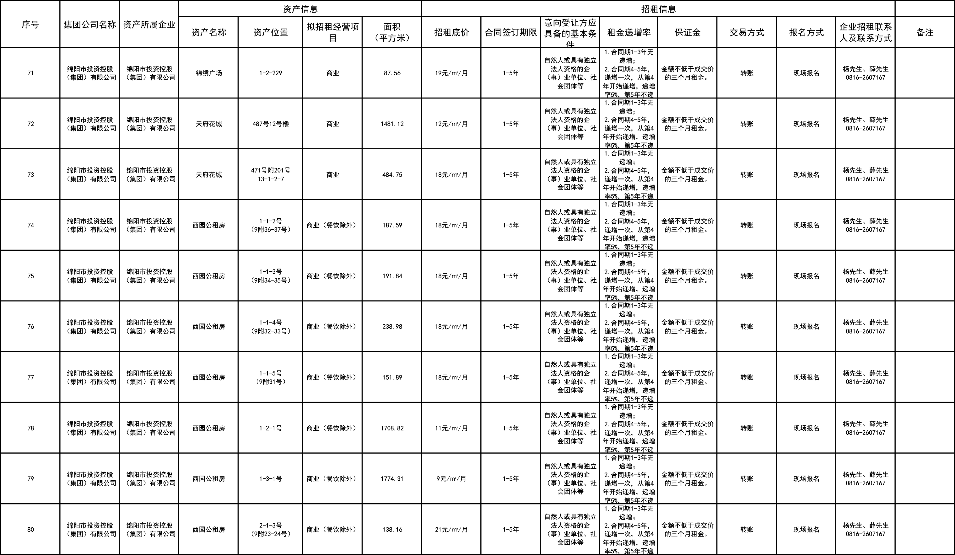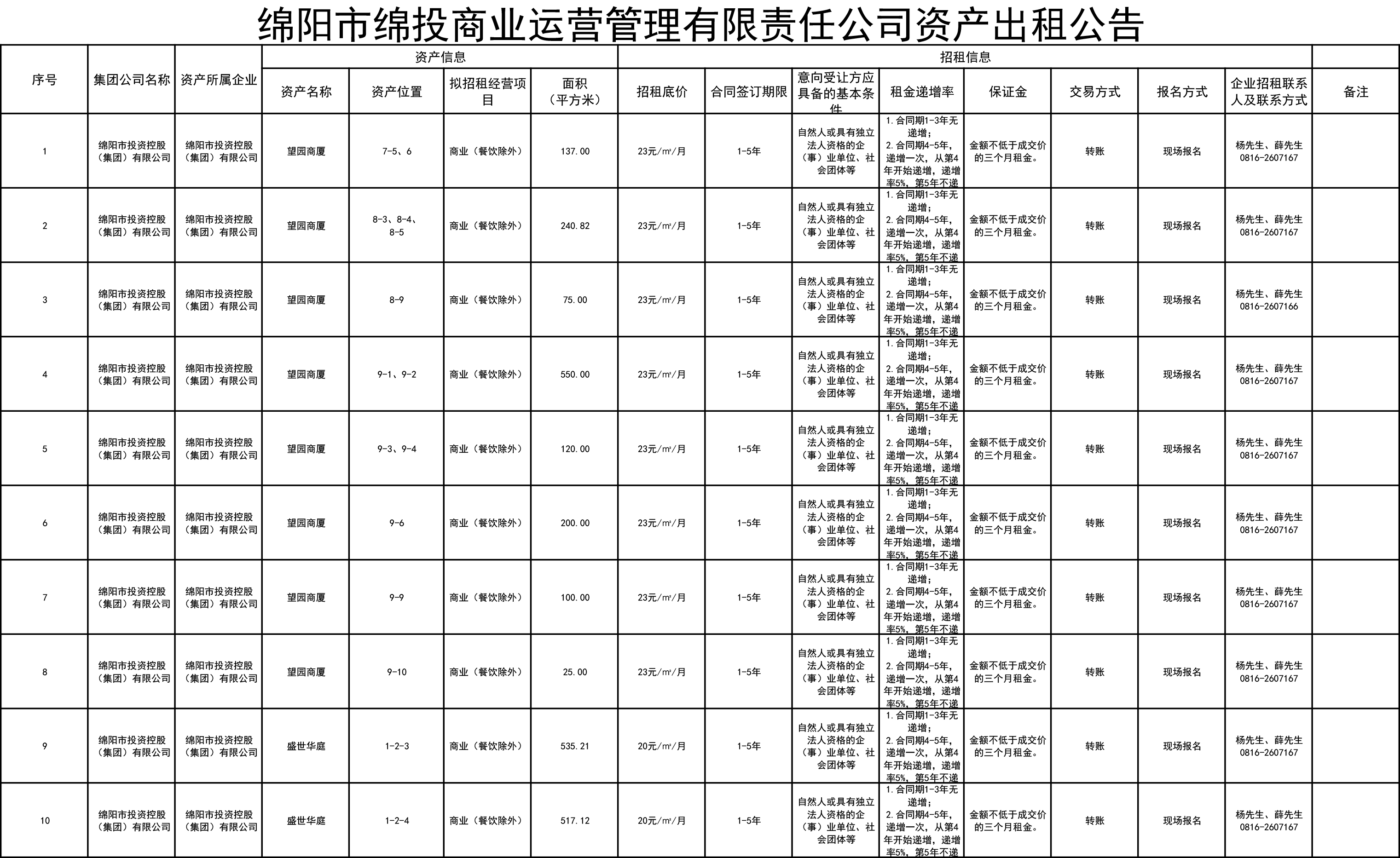 綿陽(yáng)市綿投商業(yè)運(yùn)營(yíng)管理有限責(zé)任公司資產(chǎn)出租公告